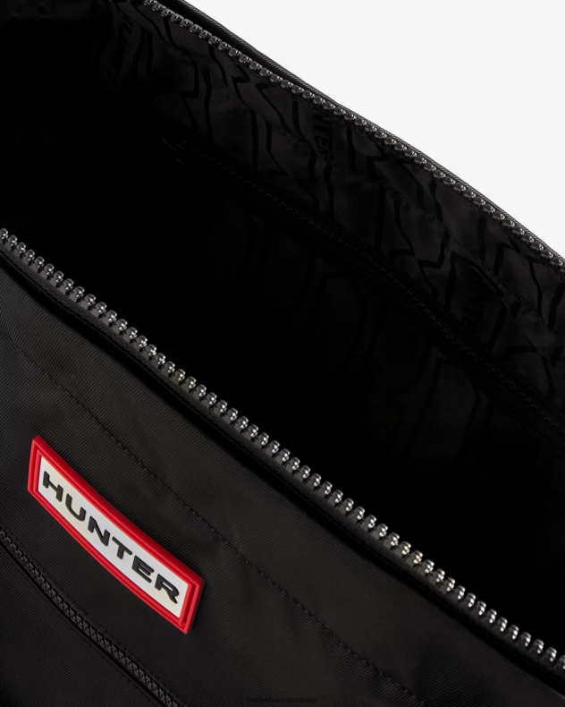 With a recycled polyester lining, a water-resistant exterior and a reinforced base, our black Nylon Large Top Clip Tote will protect your possessions, whatever the weather. The interior has multiple pockets for easy access to key necessities and enough space for a laptop and a change of clothes. On the outside is a detachable adjustable strap and a side clip, which means this bag can be attached to our other, smaller Hunter Totes.