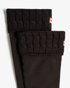 Re-designed with left and right foot shaping, these black boot socks offer the most enhanced fit and comfort and will fit easily inside the Original Tall Rain Boot. They feature the Hunter Original logo, a cosy knitted 6-stitch cable fold down cuff and a fleece leg made from 100% post-consumer recycled polyester.